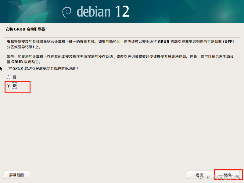 16.是否将GUIB启动引导器安装至主驱动器,选择“是”,点击继续。