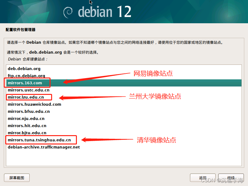 选择所需的仓库镜像站点,这里选择“清华”的镜像;点击继续。