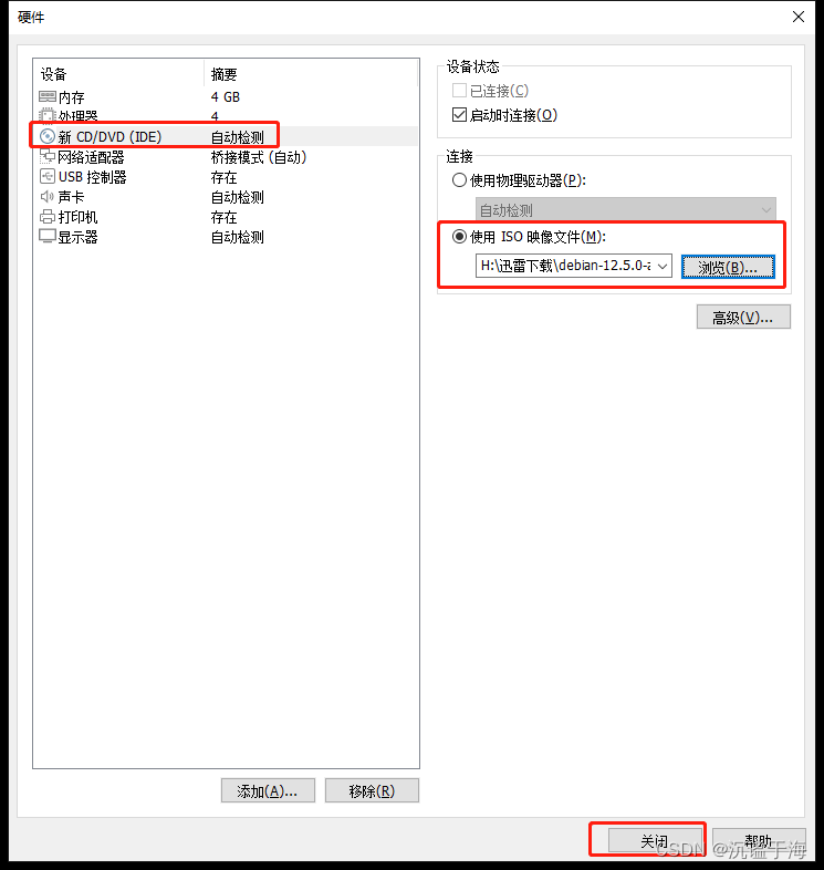 2.点击“新CD/DVD(SATA)”→点击“浏览”→选中已有的镜像路径→点击下方的关闭按钮。