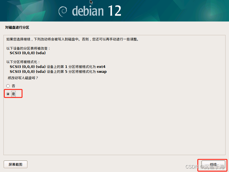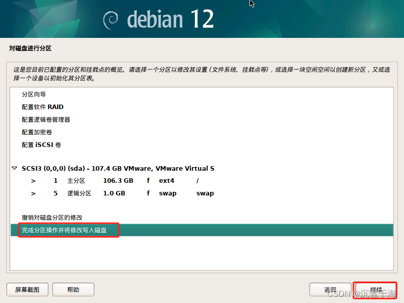 选中“完成分区操作并将修改写入磁盘”,点击继续。