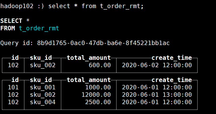 create table t_order_mt(id UInt32, sku_id String, total_amount Decimal(16,2), create_time Datetime)engine = MergeTree partition by toYYYYMMDD(create_time) primary key(id) order by (id,sku_id);