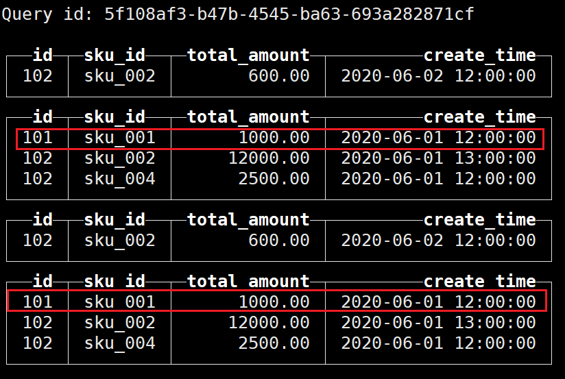 (101,'sku_001',1000.00,'2020-06-01 12:00:00') ,\