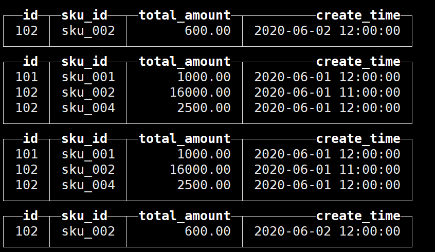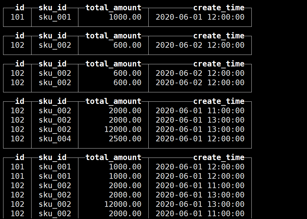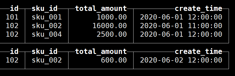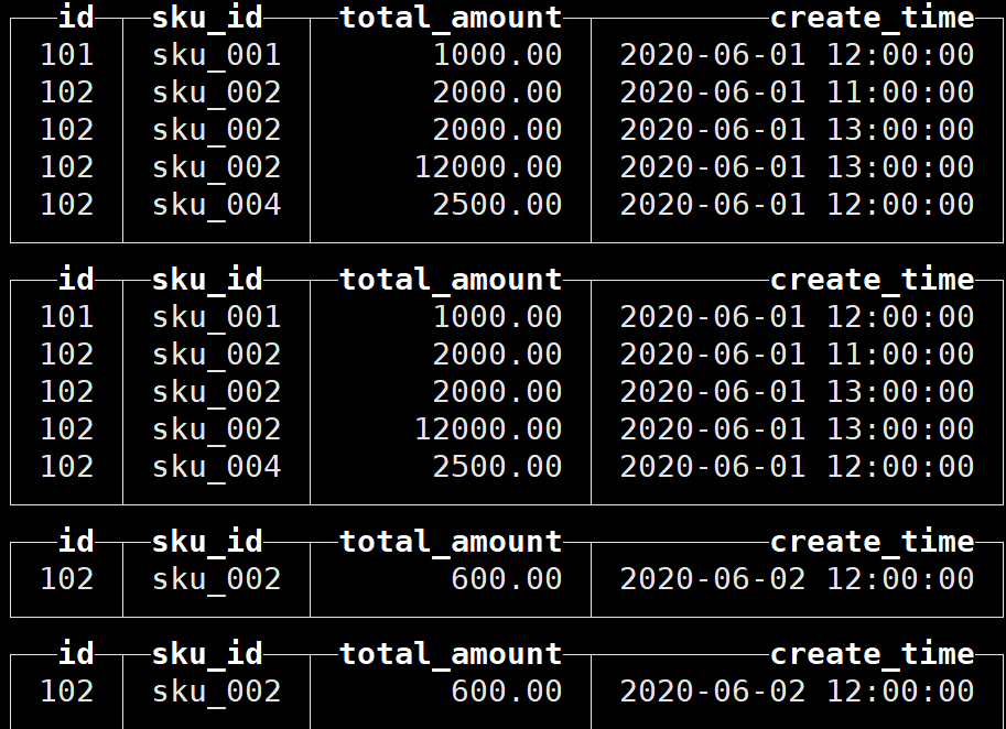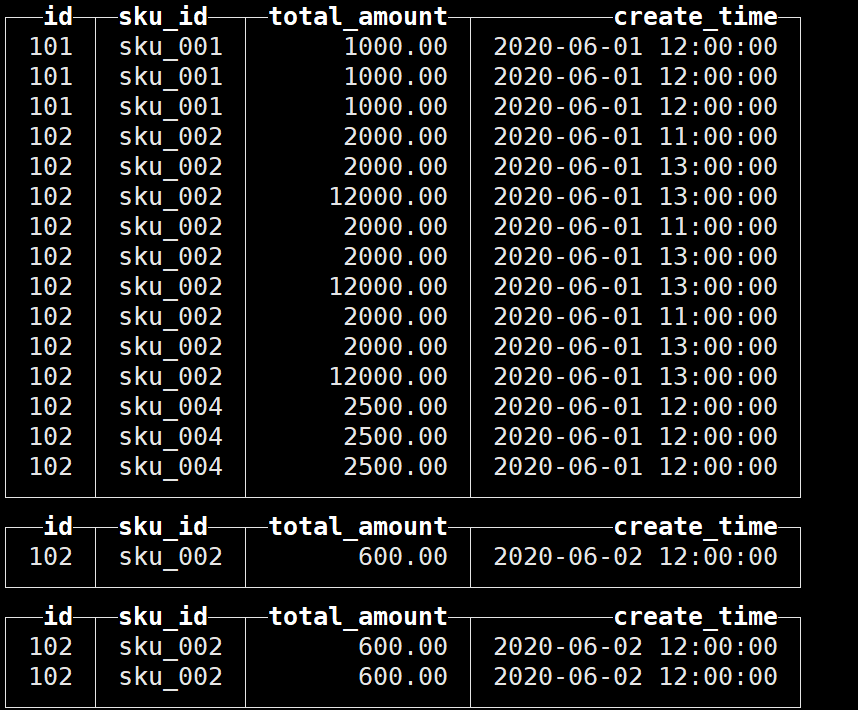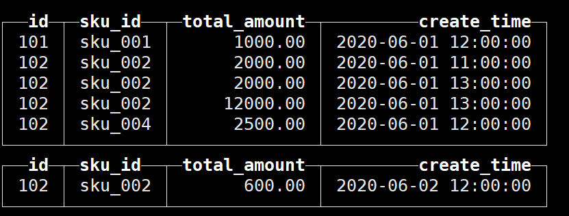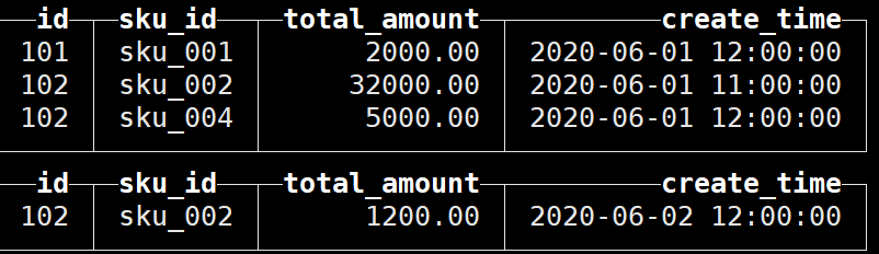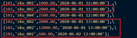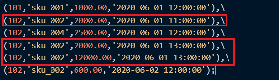 (102,'sku_002',2000.00,'2020-06-01 13:00:00'),\