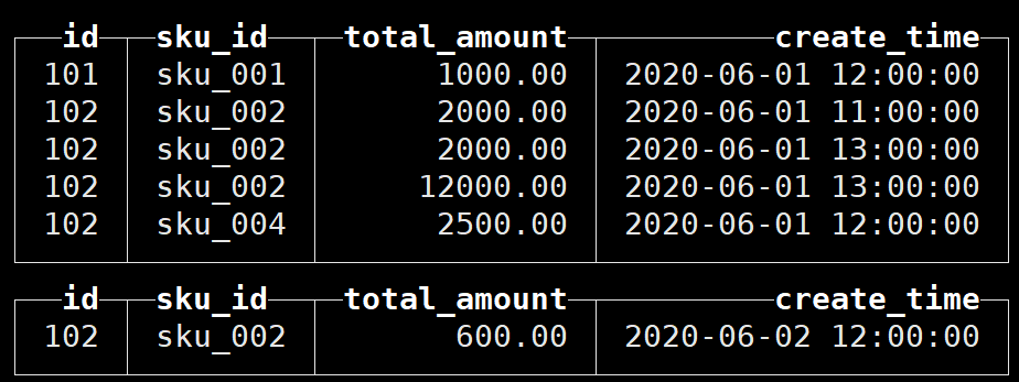 (101,'sku_001',1000.00,'2020-06-01 12:00:00'),\