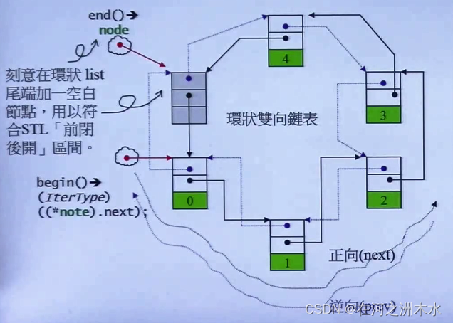由上面的结构上可以看出,list 是一个循环链表,链表的尾端是一个空节点,不存储任何数据。