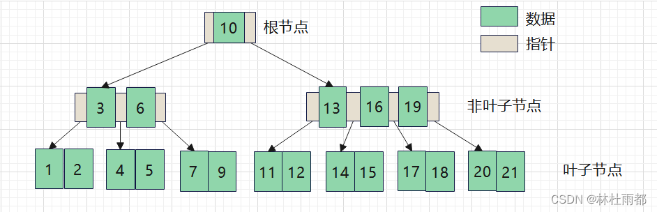 - 非叶子节点满足:关键字范围(t-1) ~ (2t-1)