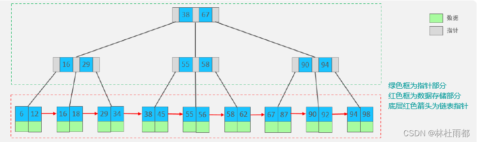 - 所有叶子节点使用链表连接形成有序链表,提高了范围查询的效率。