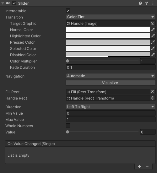 Value 是 Slider 的具体数值,在脚本中通过 slider.value进行访问。最下方的 On Value Changed 为 Slider 值变化时触发的事件。
