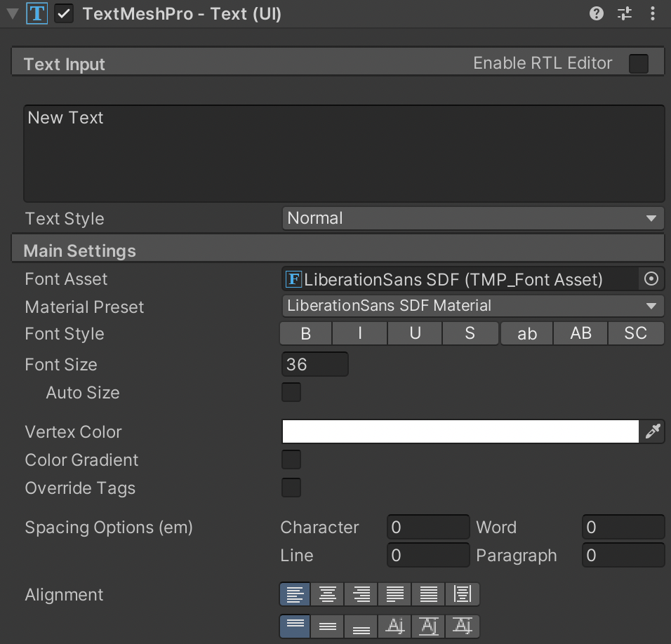 Alignment 属性为对齐方式,这里选择的是完全居中。需要注意的是,这里设置的效果仅对当前 Text 对象生效。场景中每个 Text 对象的对齐方式只会作用于自身。