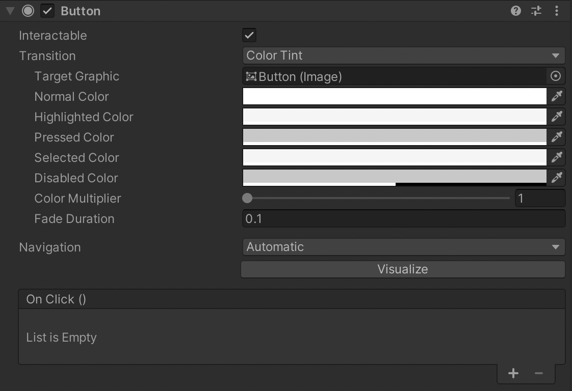 在 Button 组件中,参数 Interactable 用于选择是否可交互,如果取消勾选将变为 Disabled 状态。此时,按钮外形会发生变化,同时不再接收鼠标点击事件。参数 Transition 表示按钮各个状态下的外观变化,默认为 Color Tint, 也就是说拨钮的不同状态完全可通过颜色来表示。Normal Color表示正常情况下按钮的颜色;Highlighted Color表示鼠标移动到按钮上但并没有点击时的颜色,默认和 Normal Color 一致,都为白色:Pressed Color 表示按钮被按下时的颜色,Disabled Color表示按钮不可用时的颜色。