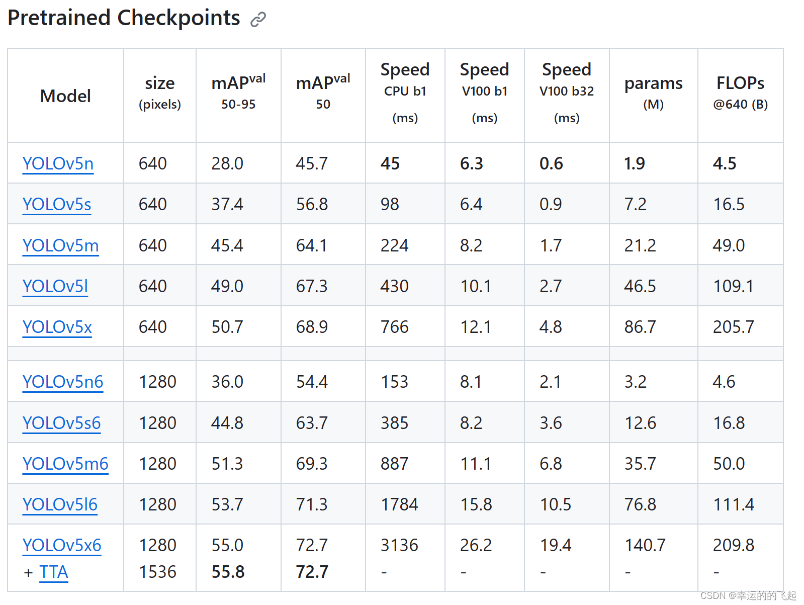 Yolov5主要分为五种网络模型(YOLOv5n、YOLOv5s、YOLOv5m、YOLOv5l、YOLOv5x):针对于640*640:针对于1280*1280:Yolov5有n,m,s,l,x五种结构,主要是网络层次结构的深浅,x的网络层次和通道数最多。yolov5系列不同的版本之间主要的框架结构都是相同的,只是根据不同的需要,在细节部分有所不同,比如使用的激活函数不同,或者是更换了不一样的边