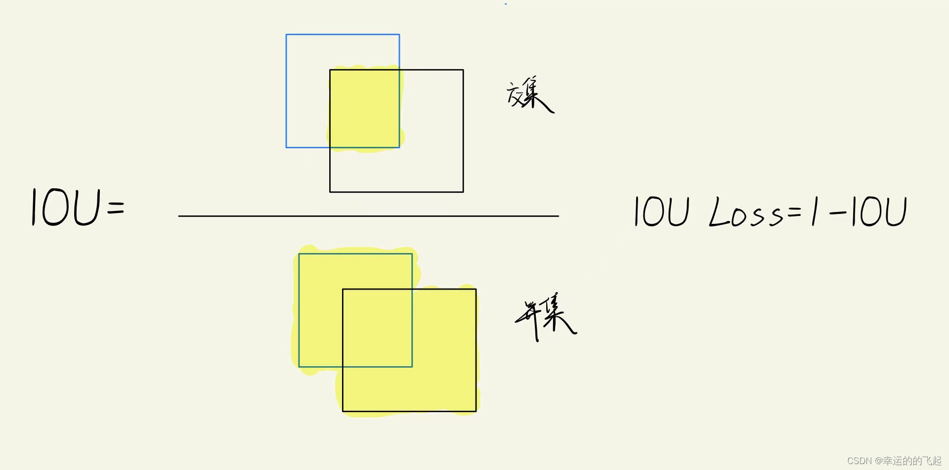 IOU Loss :检测框与目标框重叠面积,即IOU Loss=1-(交集/并集)。但是当两个框没有交集时,IOU Loss为0,无法反映两者之间的距离大小。