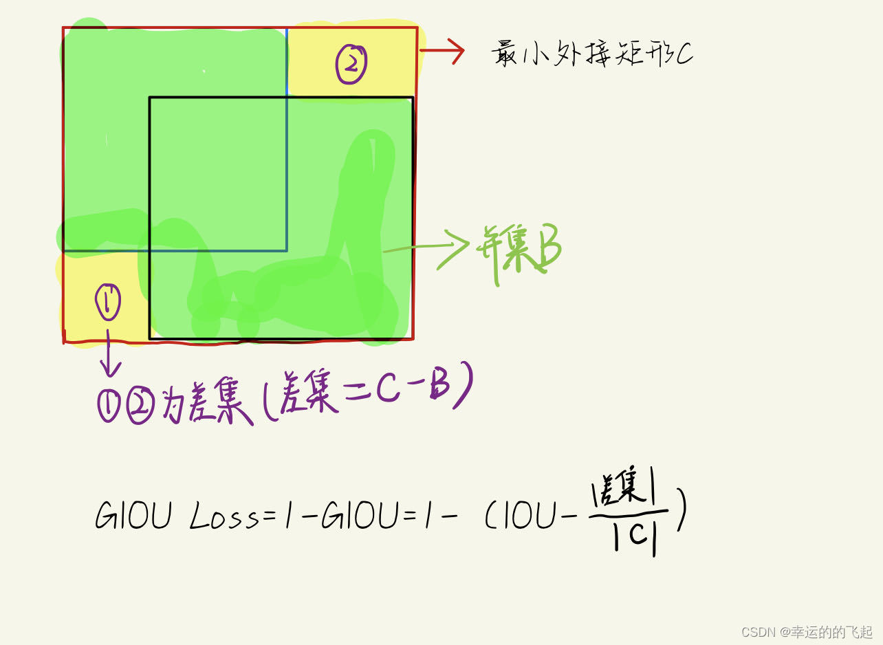 GIOU Loss:在IOU的基础上,它通过计算两个框的最小外接矩形面积,再计算出IOU,然后计算矩形面积中不属于两个框的区域占矩形面积的比重,最后用IOU减去这个比重得到GIOU。