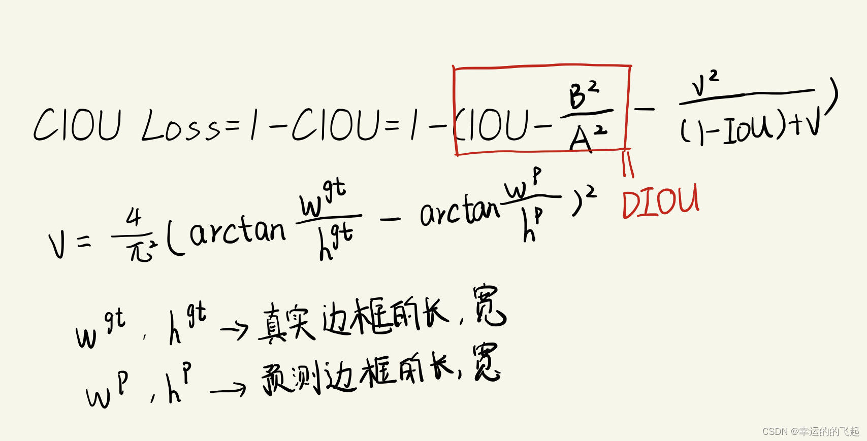 CIOU Loss:在DIOU的基础上,它增加了预测框长宽比和目标框长宽比之间的关系进行添加,提升了损失函数的抑制效果,加强了待测目标的统一性。