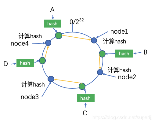 如下图所示,我们有A,B,C,D四个数据对象,经过hash计算之后,其在图中的位置和应该存在的节点位置如下: