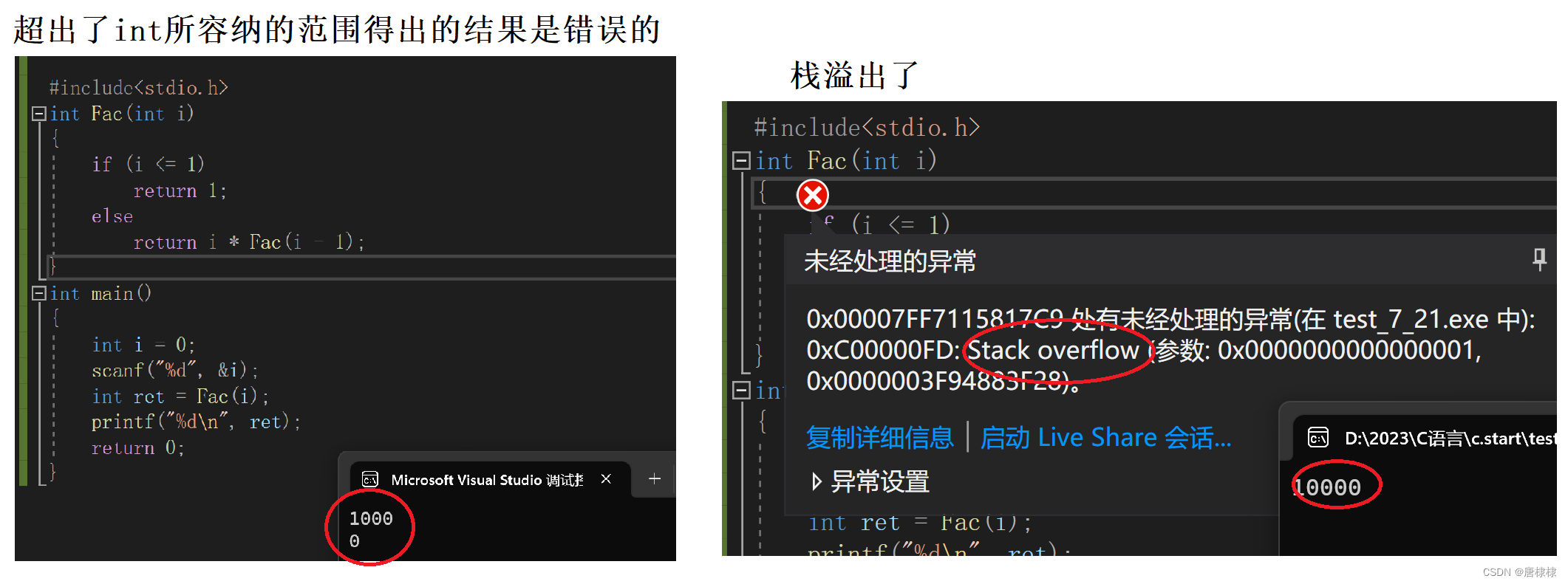 第二种情况:栈溢出。参数比较大,报错:stack overflow。系统分配给程序的栈空间是有限的,但是如果出现了死循环,或者(死递归),这样有可能导致一直开辟栈空间,最终产生栈空间耗尽的情况,这种现象我们称为栈溢出。(栈空间大小我们可以修改)。