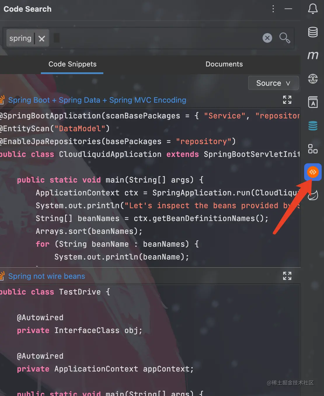 我们可以点击右边的的插件图标按钮,在搜索框里面点击搜索。在code snippest选项卡中即可给你搜索到开源的相关代码示例或者相关的问题解答。