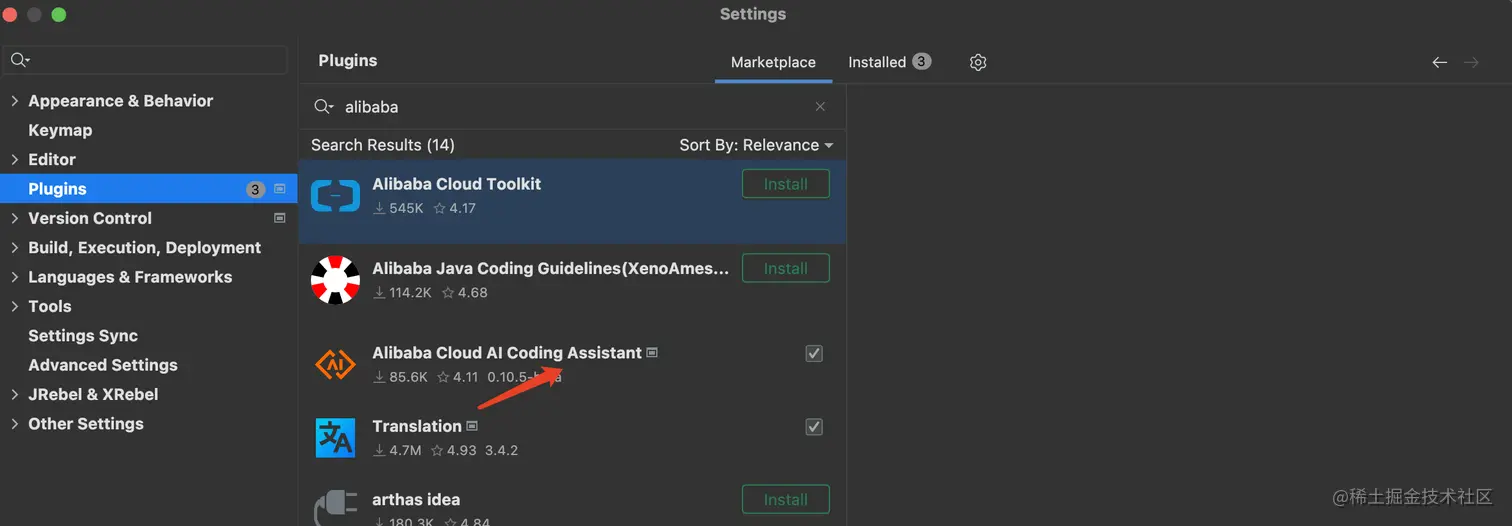 找到 Alibaba Cloud AI Coding Assistant ****插件后,点击“Install”按钮进行安装。