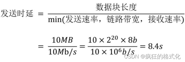 假设在某段链路上传输某个 10MB 的数据块,链路带宽为 10Mb/s ,信号传播速率为200000km/s ,链路长度为 1000 km ,则数据块的发送时延约为()。A. 1sB. 8sC. 8.4sD. 5μs【答案】 C【解析】![]()