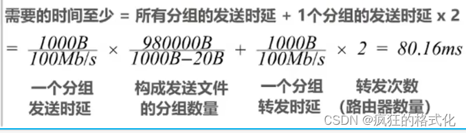题目要求忽略传播时延。因此,需要的时间至少等于所有分组的发送时延,加一个分组的转发时延乘以 2。将题目给定的已知量代入上式可得: