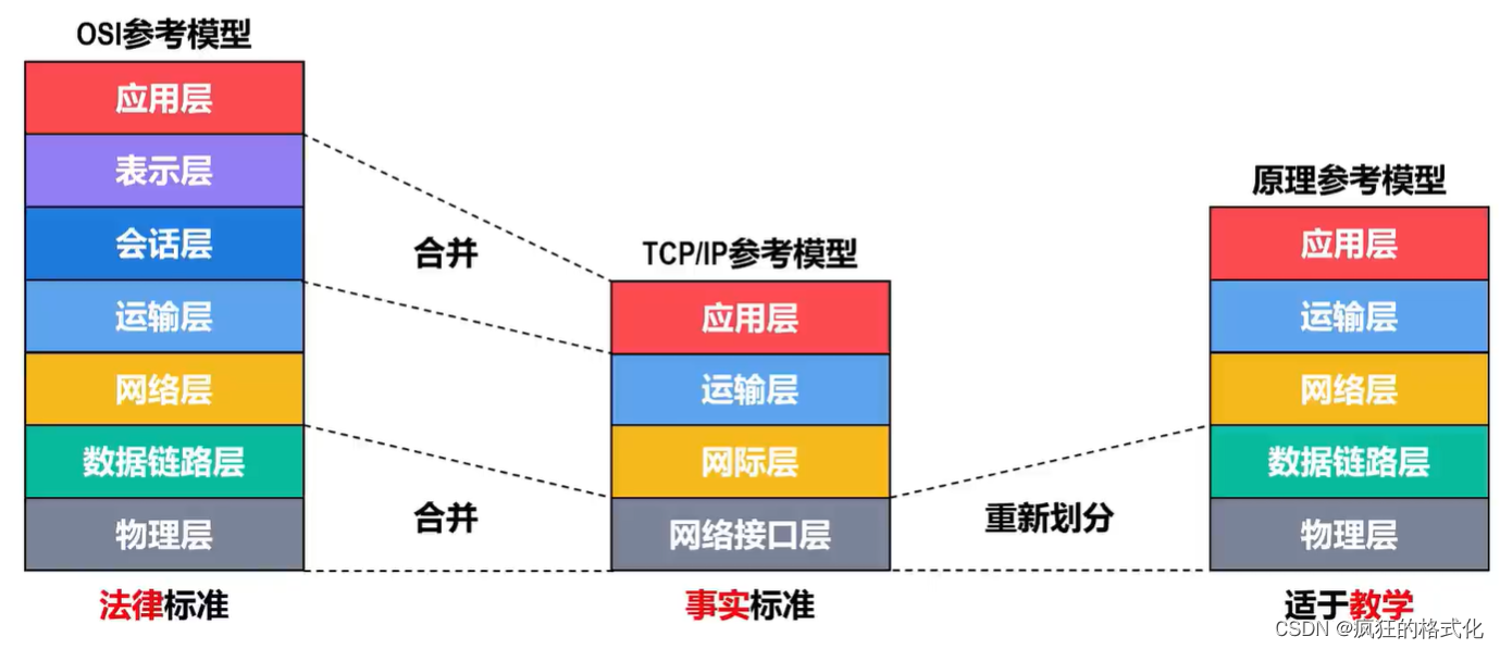 另外,我们应当知道的是全世界覆盖范围最广、用户数量最多的互联网是因特网,它采用 4 层的 TCP/IP 体系结构,自下而上依次是网络接口层、网际层、运输层、应用层。TCP/IP 体系结构相当于将 OSI 体系结构的物理层和数据链路层合并为了网络接口层,并去除了会话层和表示层,可以说 OSI 体系结构是法律上的国际标准,而 TCP/IP 体系结构是事实上的国际标准,为了可以互连全世界各种不同的网络接口,TCP/IP 体系结构的网络接口层并没有规定具体的内容。然而,这对于我们学习计算机网络的完整体系而言就会缺少一部分内容,在学习计算机网络原理时往往采取折中的办法,也就是综合 OSI 和 TCP/IP 的优点采用一种 5 层的原理体系结构,它相当于将 TCP/IP 的网络接口层又拆分成了 OSI 的物理层和数据链路层。