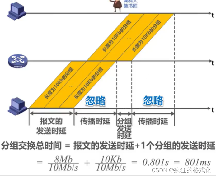 第一段是主机甲连续发送若干个分组的发送时延。题目规定,忽略分组头开销和分组拆装时间,因此第一段时间可看作是报文的发送时延。第二段是构成报文的最后一个分组的最后一个比特信号从主机甲传播到路由器的传播时延。第三段是路由器发送构成报文的最后一个分组的发送时延。第四段是构成报文的最后一个分组的最后一比特信号从路由器传播到主机乙的传播时延。题目规定,忽略链路传播延迟,则分组交换总时间等于报文的发送时延加上一个分组的发送时延。代入题目给定的已知量可得,分组交换总时间为 801ms。