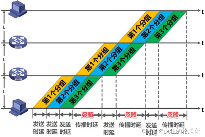 如图所示。前面三段是主机发送三个分组所耗费的发送时延;第四段是主机发送的最后一个比特的信号在第一段链路传播所耗费的传播时延;第五段是第一个路由器转发第三个分组所耗费的发送时延;第六段是第一个路由器转发的最后一个比特的信号在第二段链路传播所耗费的传播时延;第七段是第二个路由器转发第三个分组所耗费的发送时延;第八段是第二个路由器转发的最后一个比特的信号在第三段链路传播所耗费的传播时延。