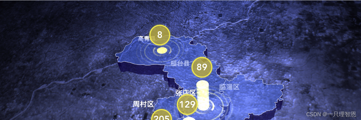 1、d3.js通过投影把地图数据的json映射到3维空间中,城市地图的json下载我就不多讲了,网上有很多教程,换成自己所需的城市就行;2、地图上展示的数据展示的label,一开始用的sprite小精灵模型做的,但是会失真不清楚,后来换成了CSS2DRenderer这种方式,就相当于把html渲染到3维空间里,屡试不爽;3、为了达到“酷炫智能”效果,在一加载和点击区县的时候,做了camera的动画