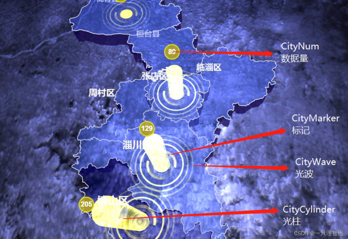 这个包含几种模型:城市光波(从城市中央扩散)、标记(自转)、光柱、数据,具体对照可以看一下下图,一目了然