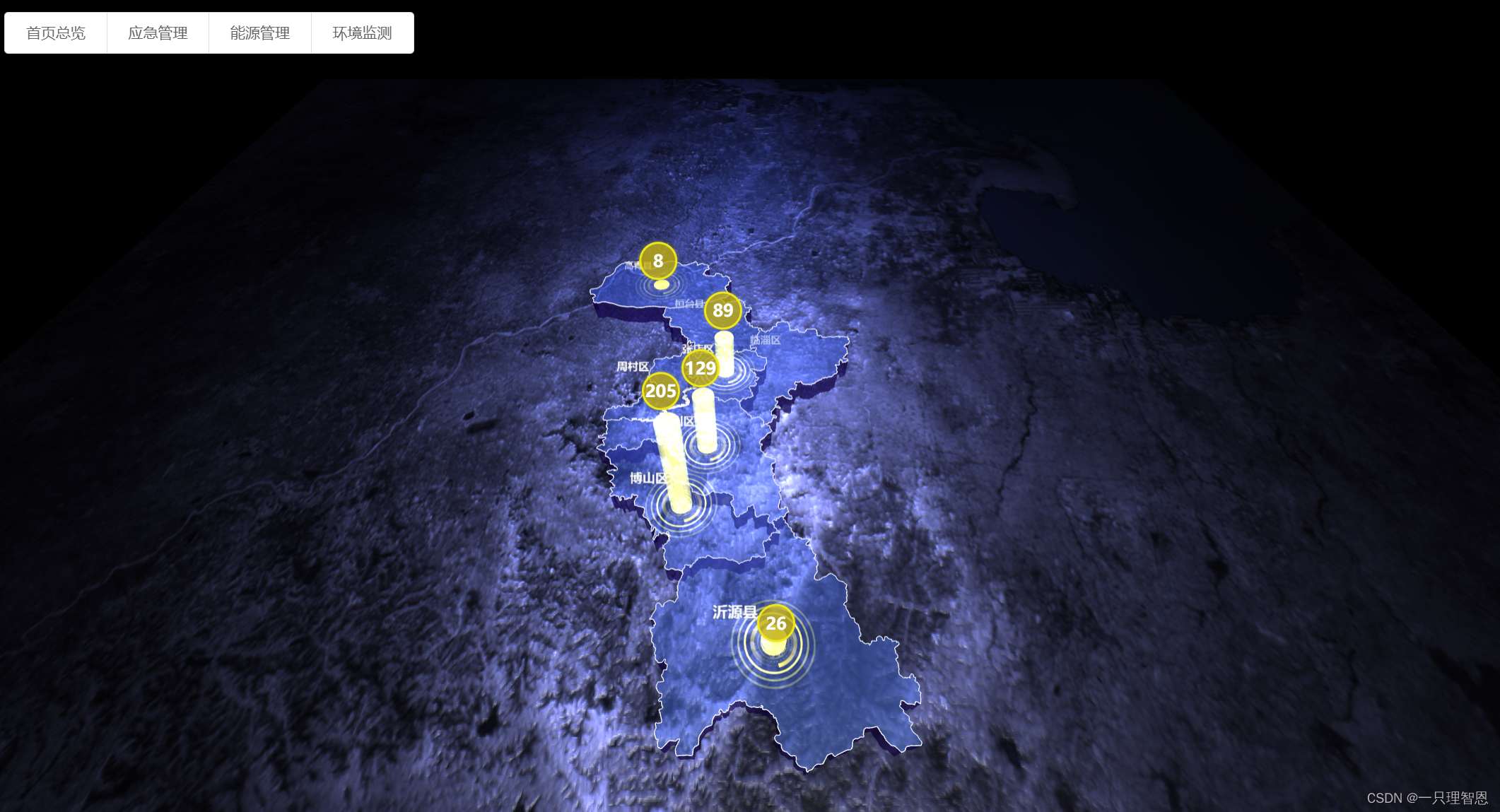比如:点击区县,摄像机拉进;点击空白,摄像机归位。页面加载完成时,摄像机从地表移动到现在的位置