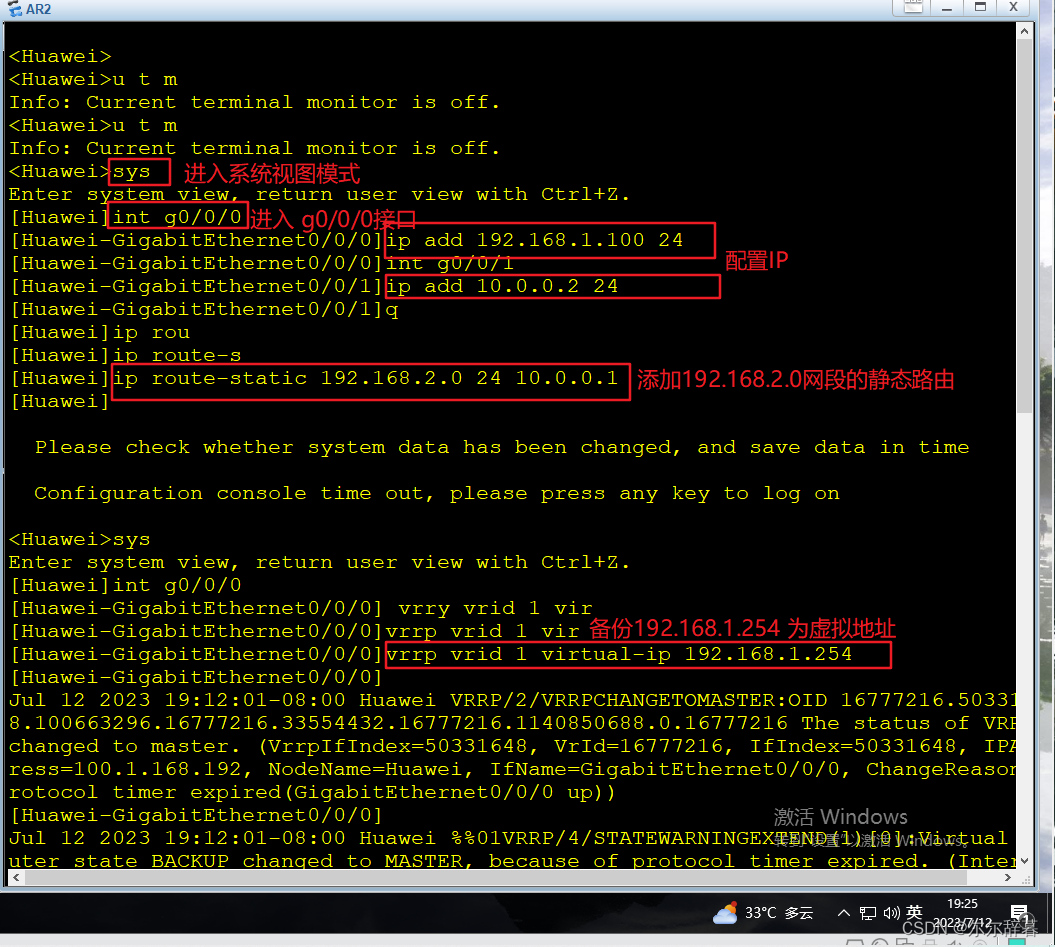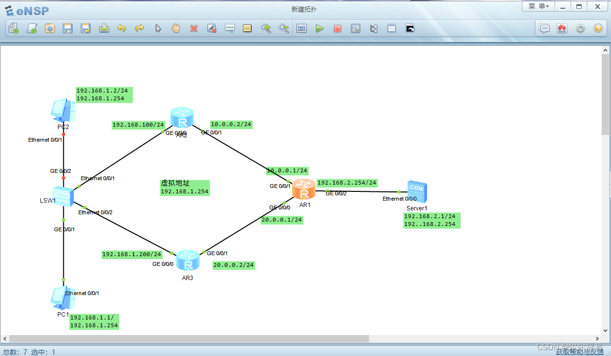 [AR2-GigabitEthernet0/0/0]vrrp vrid 1 virtual-ip 192.168.1.254 ##配置 1 组设置虚拟ip