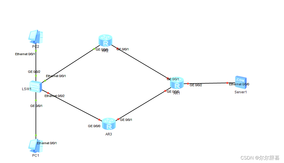 Server服务器为PC2与PC3提供服务,如果只有AR1路由器配置PC2和PC3的网关,AR1出现问题或者AR1侧的链路出现问题那PC2和PC3就无法访问server了,AR1和AR2又不能同时配置PC2和PC3的网关,所以此刻网络就瘫痪了需要手动去配置AR2。此时若是可以自动切换到AR2就不会出现网络瘫痪的问题,运用VRRP协议可以提供这种自动切换的服务