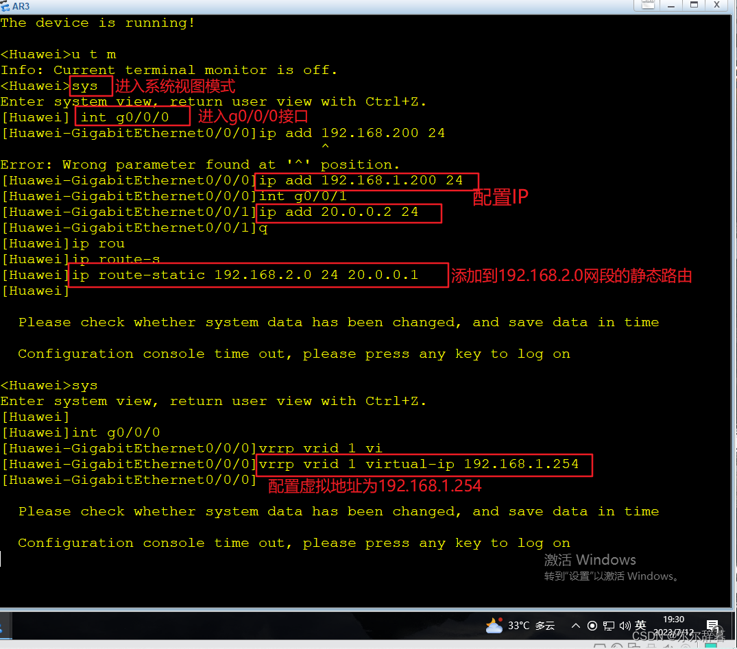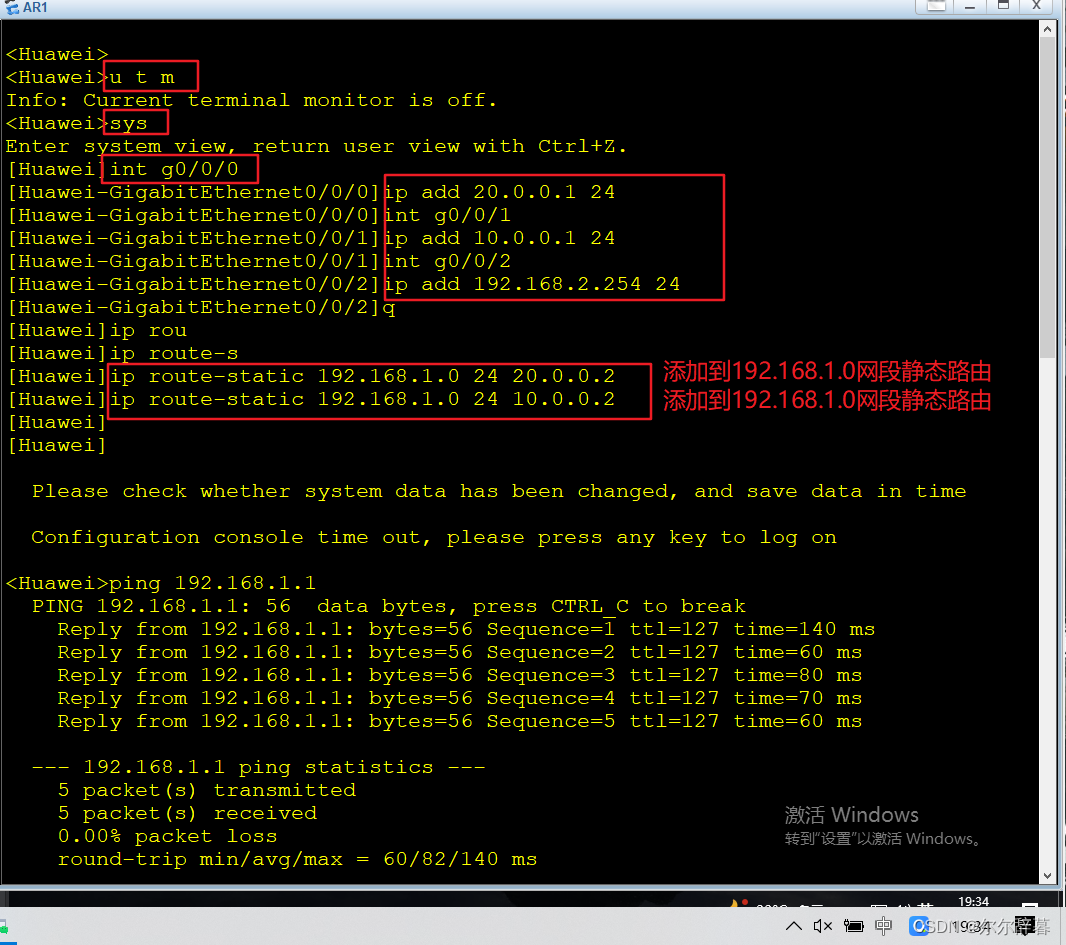 [Huawei]ip route-static 192.168.1.0 24 20.0.0.2 ##添加到192.168.1.0网段的静态路由