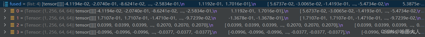 接着我们遍历layer_out和to_fuse函数,to_fuse由一个卷积,一个上采样组成,卷积是为了让四个输出通道统一为256,upsample是为了上采样到原图1/4大小。这里to_fuse函数遍历四次,是因为每个encoder输出都要进行特征和大小的同一。fused也有四个输出。