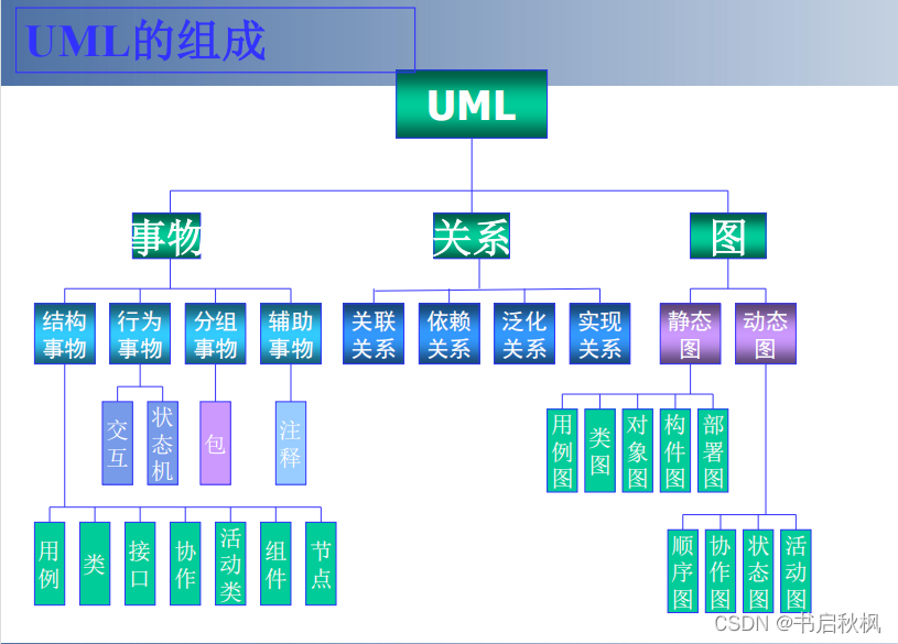 目录一、 UML类图思维导图二、用例图类的基本表示方式三、用例图类与类的四种关系1.继承关系2.实现关系3.依赖关系4.关联关系5.聚合关系6.组合关系四、对象图五、系统的状态图五、系统的活动图六、系统的时序图七、系统的协作图八、系统的组件图九、系统的配置图一、 UML类图思维导图二、用例图类的基本表示方式在UML类图中,每一个矩形代表一个类。我们举一个简单的例子:一般的类图分为三个部分。部