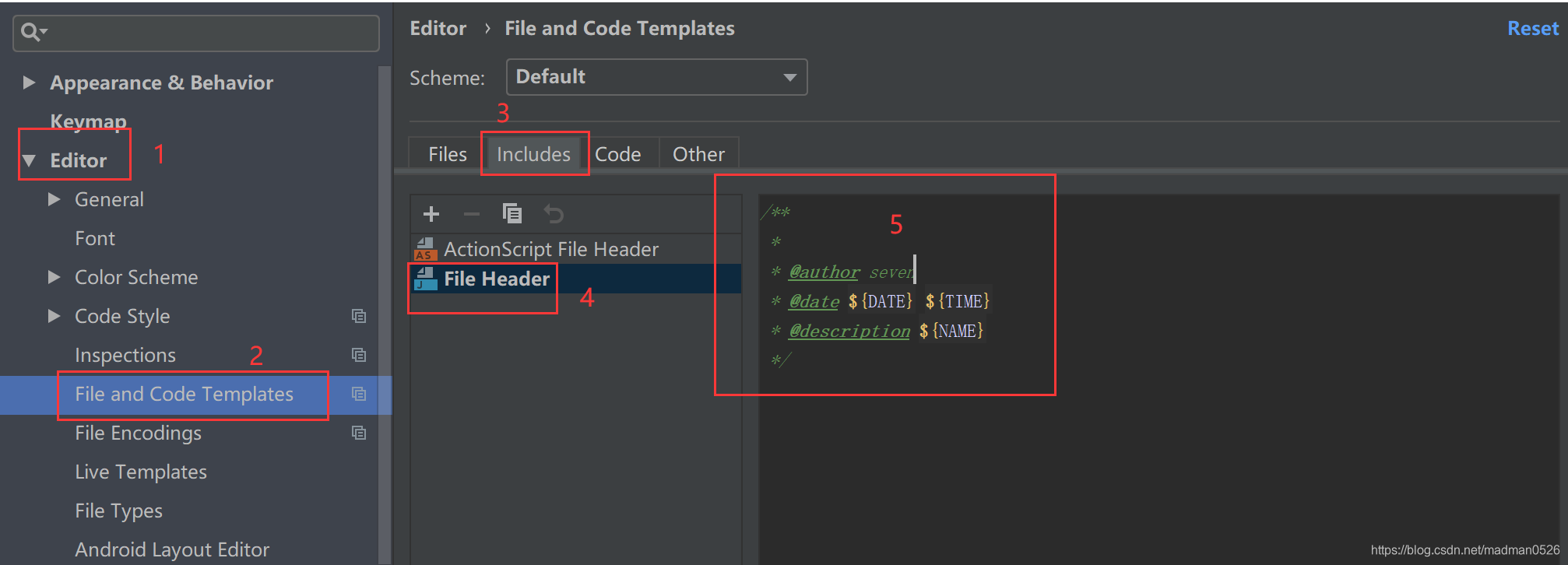 1、打开设置界面:File->Settings->Editor->File and Code Templates(或快捷键Ctrl+Alt+S)选择Includes,光标移到File Header,可直接编辑你想要的内容及格式,也可新建一个。/**** @author ${USER}* @date ${DATE} ${TIME}* @descriptio...