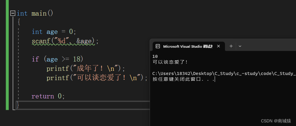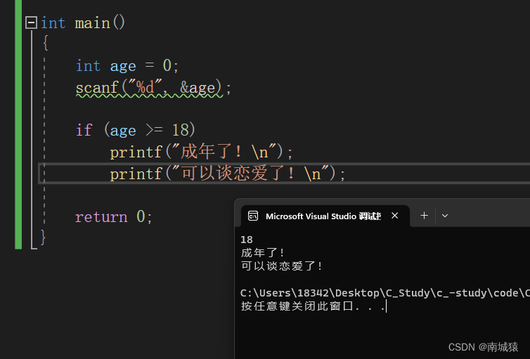 这是因为 if 语句只能控制一条语句,就是 printf("成年了\n");,if语句为真,则打印成年了if语句为假,则不打印,对于 printf("可以谈恋爱了\n");是独立存在的,不管if语句的条件的真假,都会被执行。那如果我们要if语句同时控制2条语句。