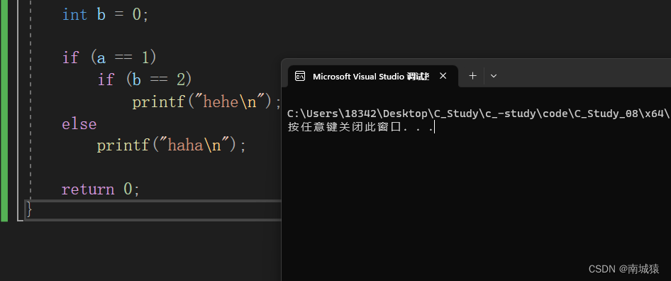 上面的代码排版,让 else 和第一个 if 语句对齐了,让我们以为 else是和第一个 if匹配的, 当 if 语句不成立的时候,自然想到的就是执行 else 子句,打印 haha ,但实际上 else 是和第二个 if 进行匹配的,这样后边的 if...else 语句是嵌套在第一个 if 语中的,如果第一个 if 语句就不成立,嵌套 if 和 ese 就没机会执行了,最终啥都不打印。