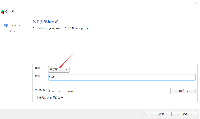 1.2、选择“共享库”,输入DLL的名称,然后点击“下一步”按钮,接下来的页面默认下一步即可。