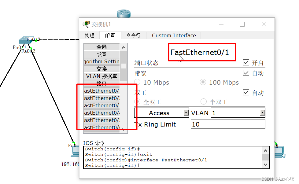(4)接口配置模式:Switch(config)#interface fastethernet0/1
