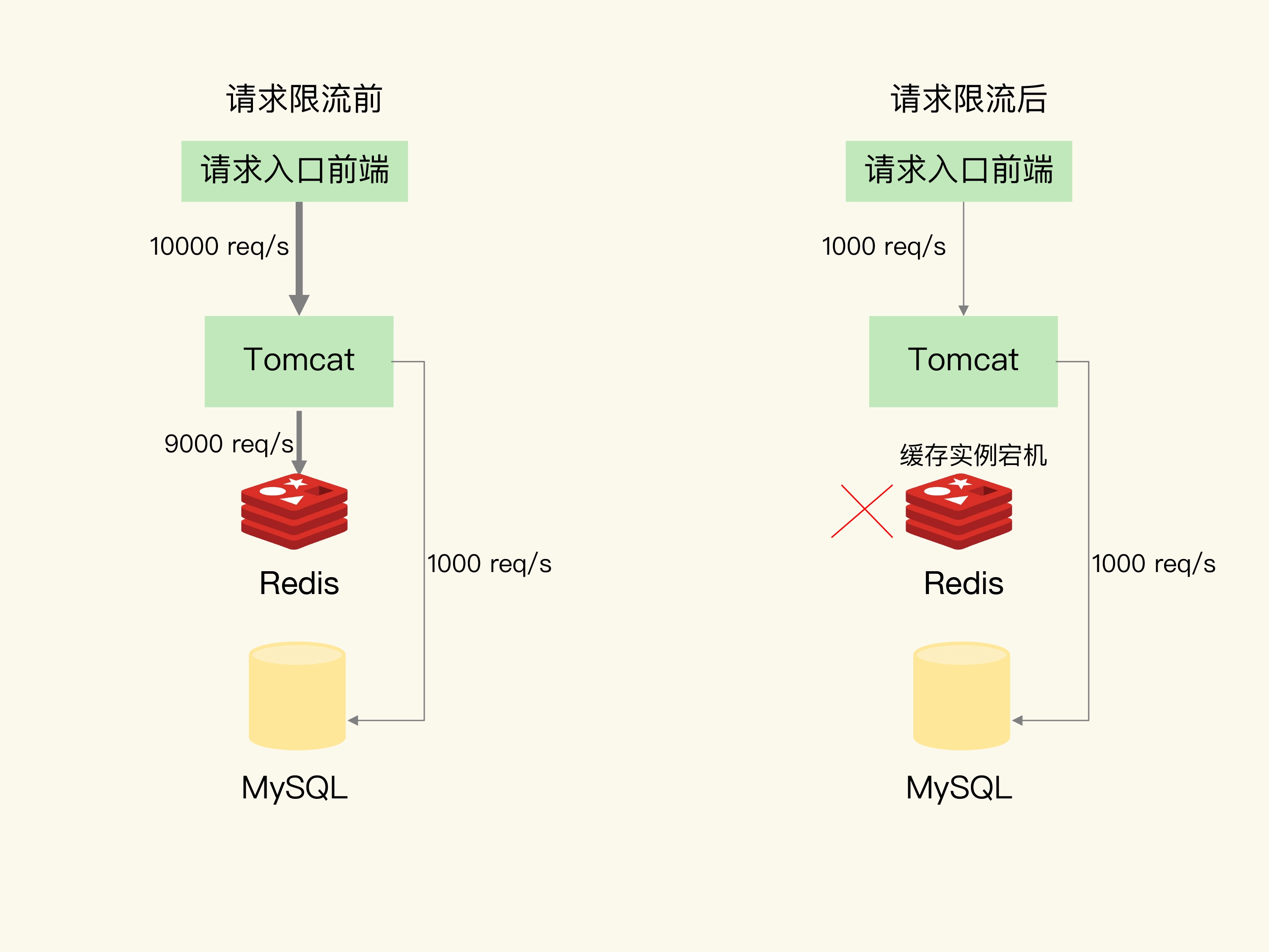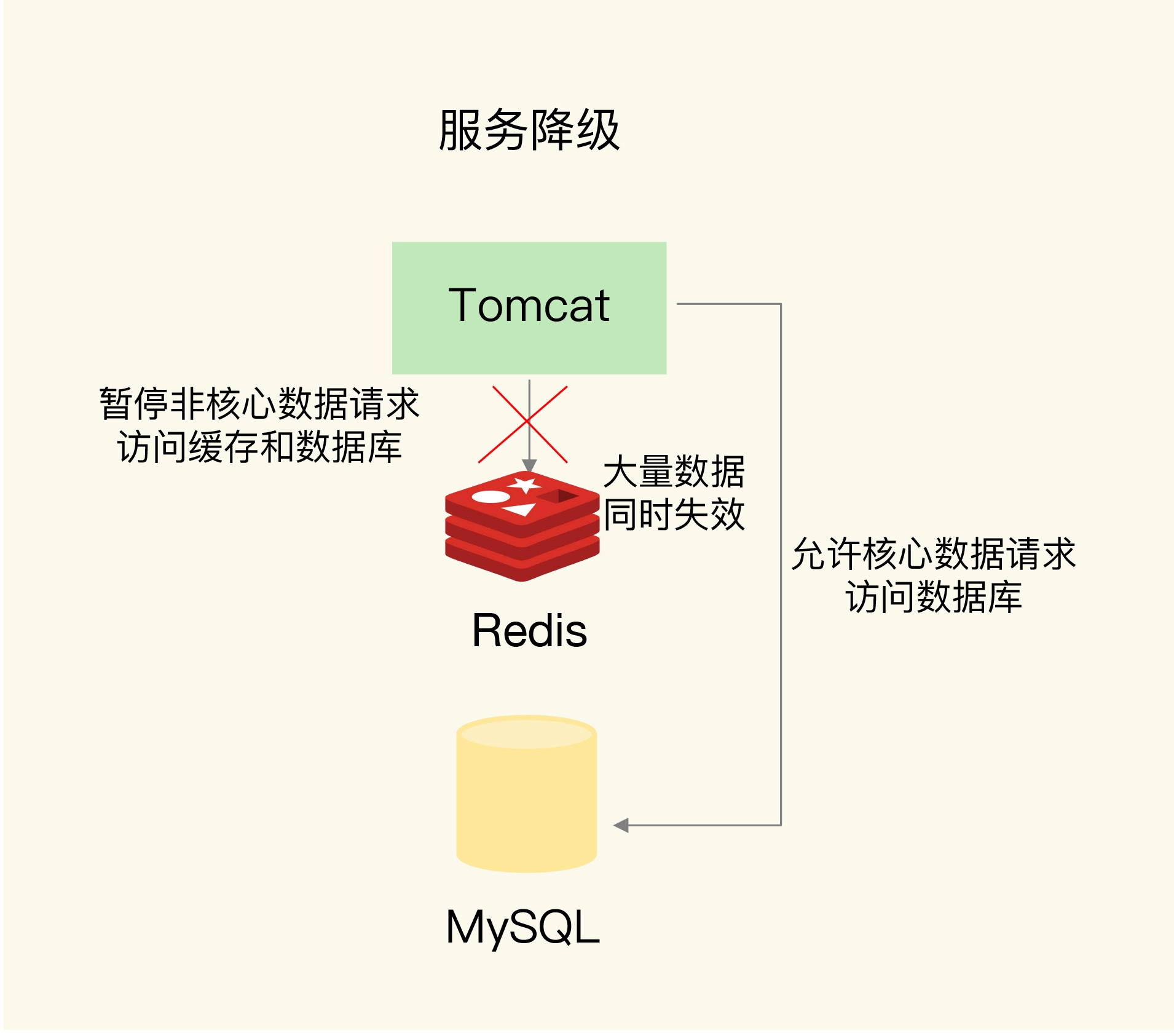 - 服务降级。非核心数据,直接返回预定义信息,错误或空值。核心业务仍然查询缓存。减少数据库压力