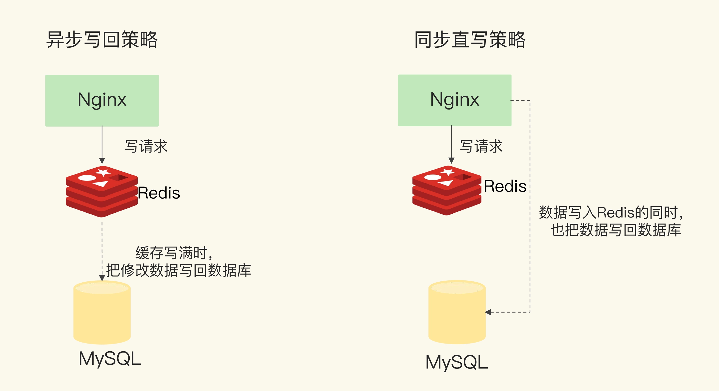 但是由于 redis 是内存数据库存在数据丢失的风险,所以还是需要写入到后端数据库中保证可靠性。有两种写入策略: