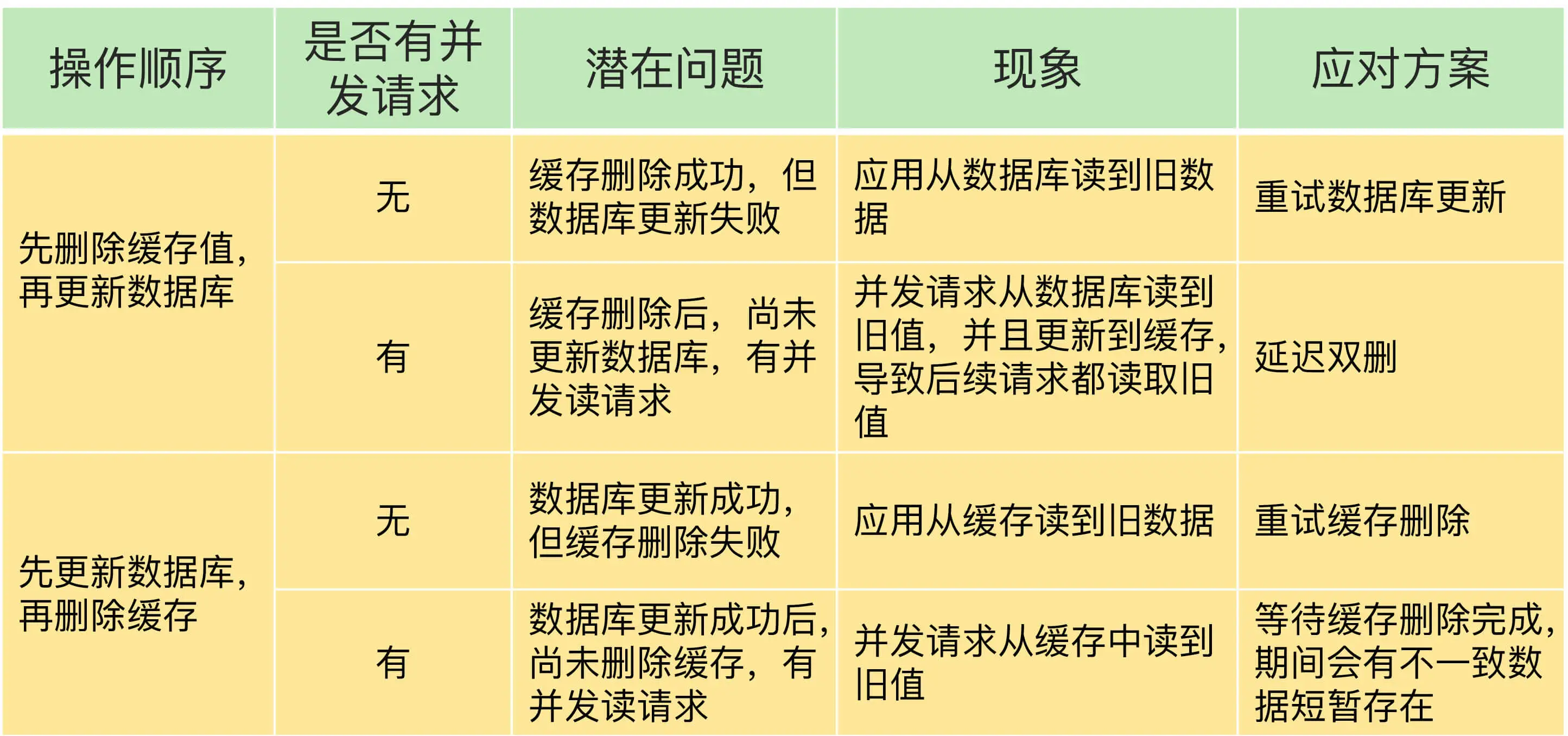 我们假设应用先删除缓存,再更新数据库,如果缓存删除成功,但是数据库更新失败,那么,应用再访问数据时,缓存中没有数据,就会发生缓存缺失。然后,应用再访问数据库,但是数据库中的值为旧值,应用就访问到旧值了。
