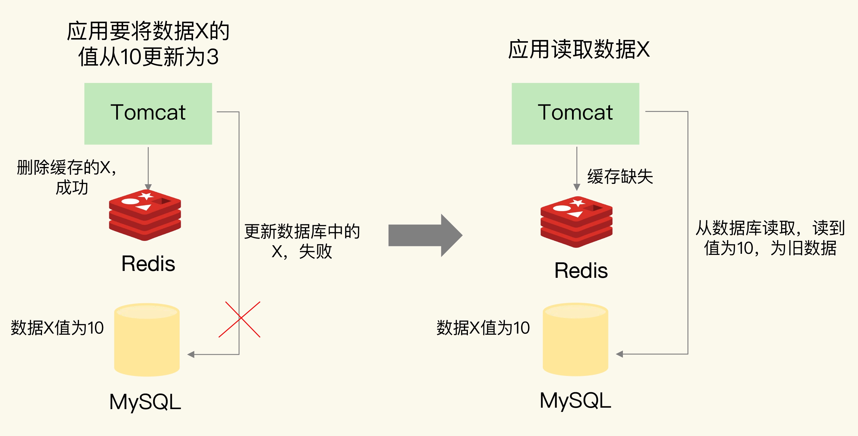 在更新数据库失败的情况下,另一个线程进来读取数据,发现缓存缺失,查询数据库的数据,并更新到缓存中,最终缓存中存储的是旧的数据。