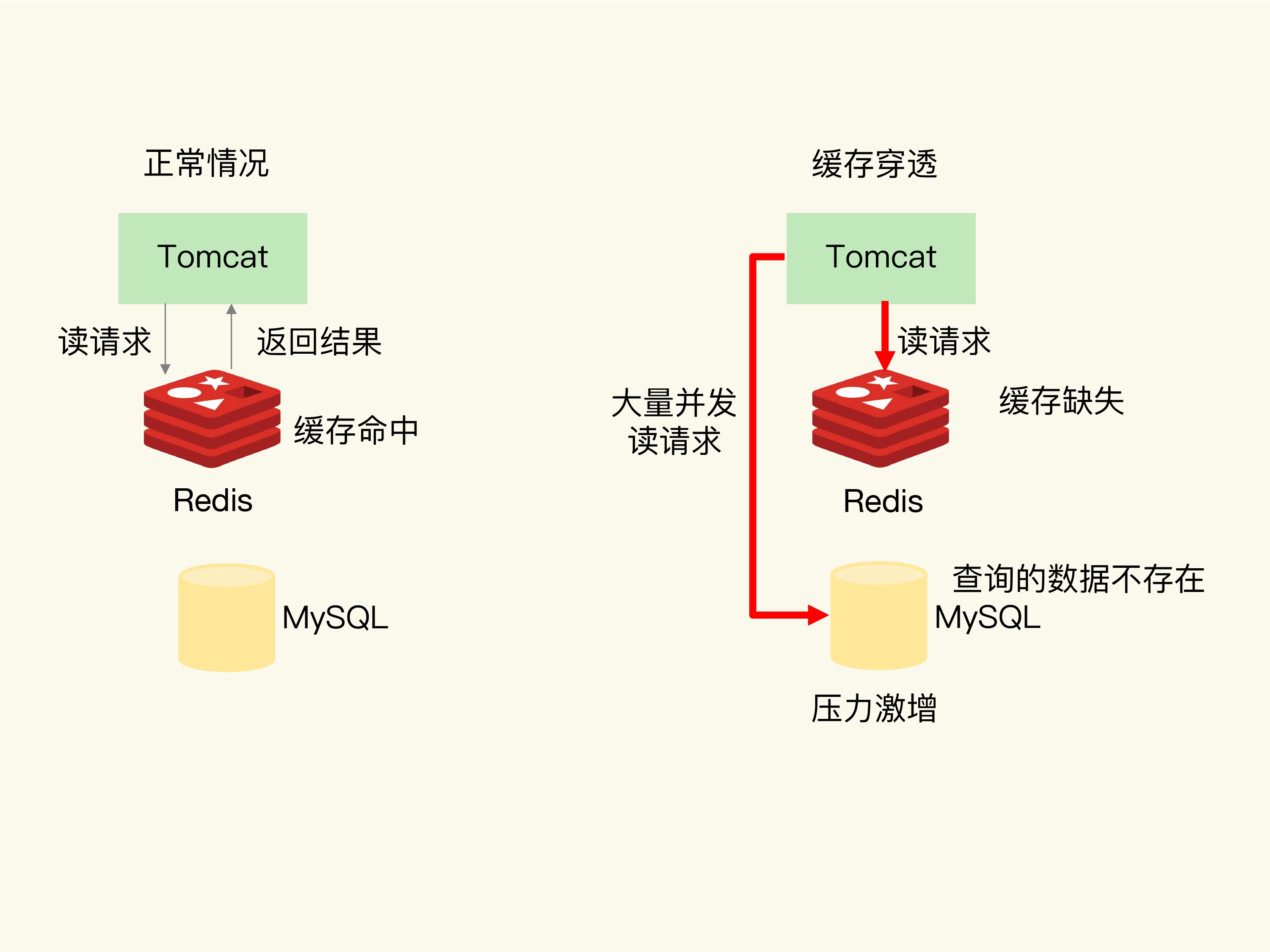 缓存穿透是指要访问的数据既不在 Redis 缓存中,也不在数据库中,导致请求在访问缓存时,发生缓存缺失,再去访问数据库时,发现数据库中也没有要访问的数据。