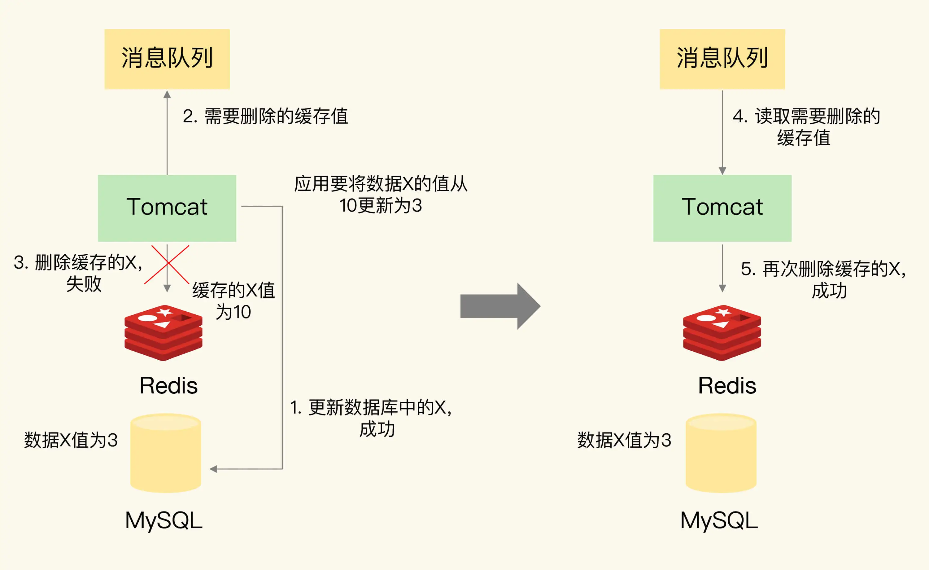 可以把要删除的缓存值或者是要更新的数据库值暂存到消息队列中(例如使用 Kafka 消息队列)。当应用没有能够成功地删除缓存值或者是更新数据库值时,可以从消息队列中重新读取这些值,然后再次进行删除或更新。