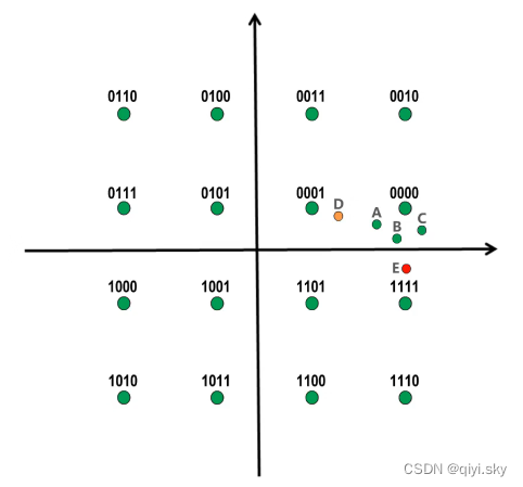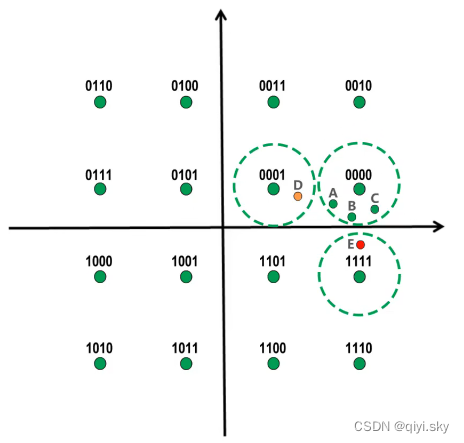 由于传输过程中产生失真,导致他们在星座图中并未落在理想的位置。
