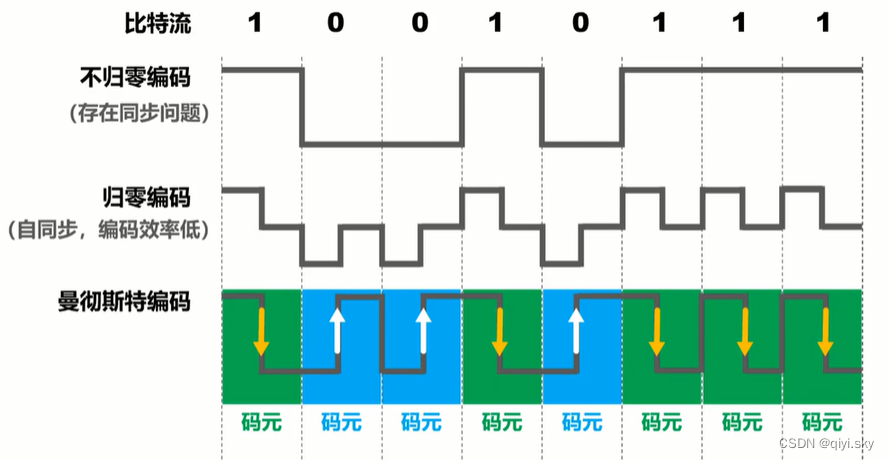 码元中间时刻的跳变既表示时钟,又表示数据。