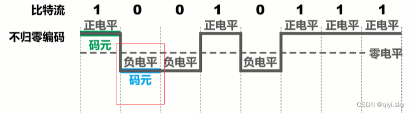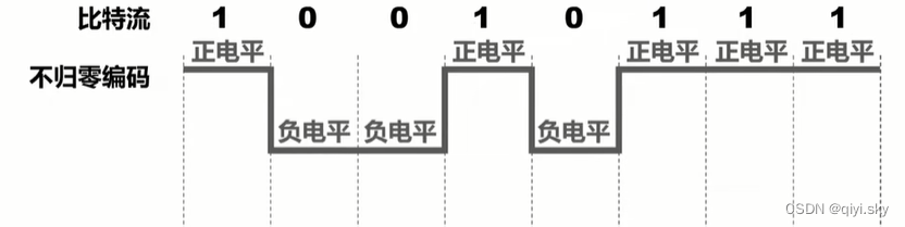 这是采用不归零编码产生的该比特流的相应信号,正电平表示比特1,负电平表示比特0。
