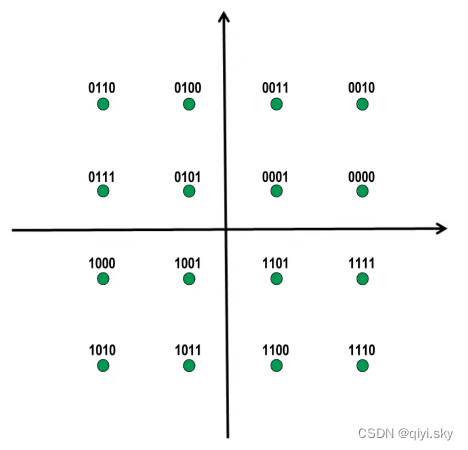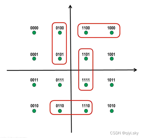每个码元与4个比特的对应关系,应该采用格雷码,也就是任意两个相邻码元只有一个比特不同。